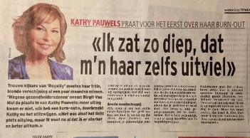 Trouwe kijkers van 'Royalty' moeten haar frêle, blonde verschijning al een paar maanden missen. 'Wegens gezondheidsredenen' neemt Birgit Van Mol de plaats in van Kathy Pauwels: meer uitleg kwam er niet. "Ik heb een burn-out", doorbreekt Kathy nu het stilzwijgen. "Het was alsof het licht plots uitging, maar ik weet nu al dat ik er sterker en beter uitkom."